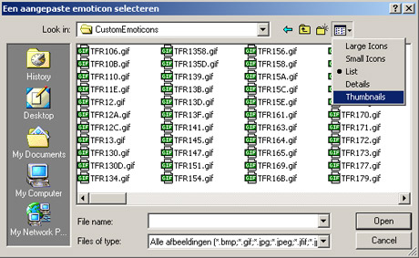 Ga naar het weergave menu rechtsboven (zoals in onderstaande afbeelding te zien is) en selecteer de optie Thumbnail. Je krijgt nu van elke emoticon een voorbeeld te zien.