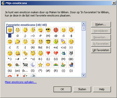 Hier zie je een overzicht met alle emoticons die op je computer beschikbaar zijn. Klik op Maken om zelf een emoticon toe te voegen.
