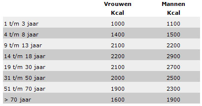 Dit is afhankelijk van je daginvulling en ook van je geslacht en leeftijd. Hieronder volgt een overzicht waarmee je globaal kunt bepalen wat je per dag nodig zou hebben om te functioneren en op gewicht te blijven.