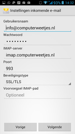 Je hebt nu de (IMAP) instellingen van je mailserver nodig om verder te kunnen gaan. De instellingen die je nodig hebt om email te kunnen ontvangen zijn: adres van de IMAP server, het beveiligingstype en een bijbehorend poortnummer. Daarnaast heb je de SMTP gegevens van je provider nodig om email te kunnen versturen.IMAP server: