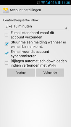 - Bij 'Accountinstellingen' kan je o.a. opgeven hoe vaak jouw mailbox gecontroleerd moet worden op nieuwe email. Schakel hier naar eigen wensen opties in of uit.