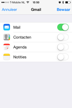 Het is nu mogelijk om, naast je email, ook bijvoorbeeld jouw Contacten en Agenda te synchroniseren. Het is verstandig om in eerste instantie alleen Mail in te schakelen. De andere opties kan je later alsnog gemakkelijk toevoegen. - Druk op Bewaar en je mailaccount wordt nu voor je opgeslagen.